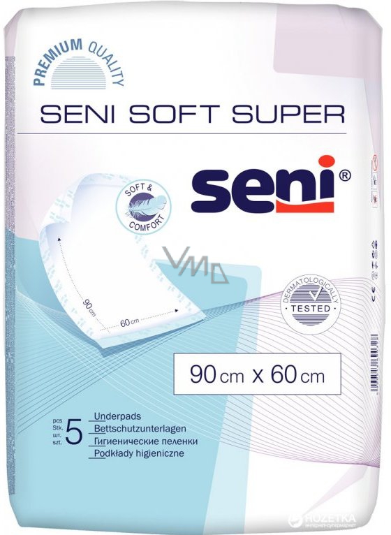 Higieniczne podkładki z absorpcyjnym rdzeniem Seni Soft Super stanowią idealną dodatkową ochronę łóżka i pościeli przed zmoczeniem i podczas wymiany pieluch.