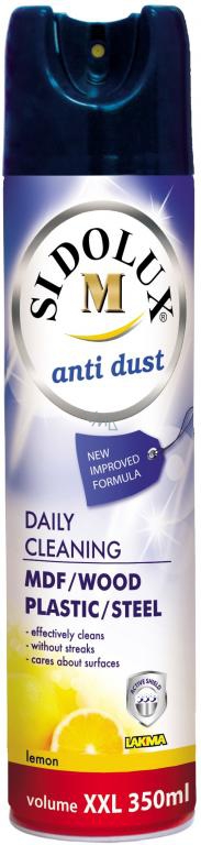 SIDOLUX M je moderní řada přípravků na ošetřování nábytku, MDF desek a umělých hmot ve formě spreje, nebo pohodlného balení s rozprašovačem.
