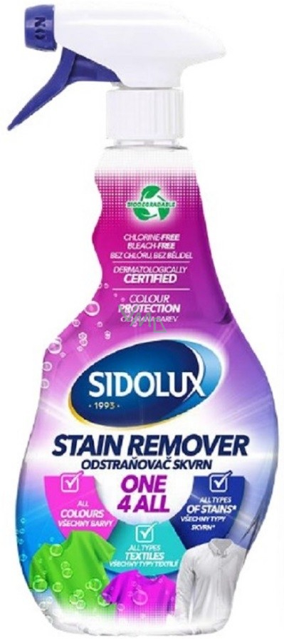 Ostraňovač skvrn Sidolux one 4 All je vhodný pro všechny typy textilií s funkcí ochrany barev. Neobsahuje chlór ani bělidla. Je dermatologicky testovaný a vhodný na všechny běžné skvrny. Před použitím vyzkoušejte stálost barev na méně viditelném místě oděvu. Nepoužívejte na materiály určené k suchému čištění.