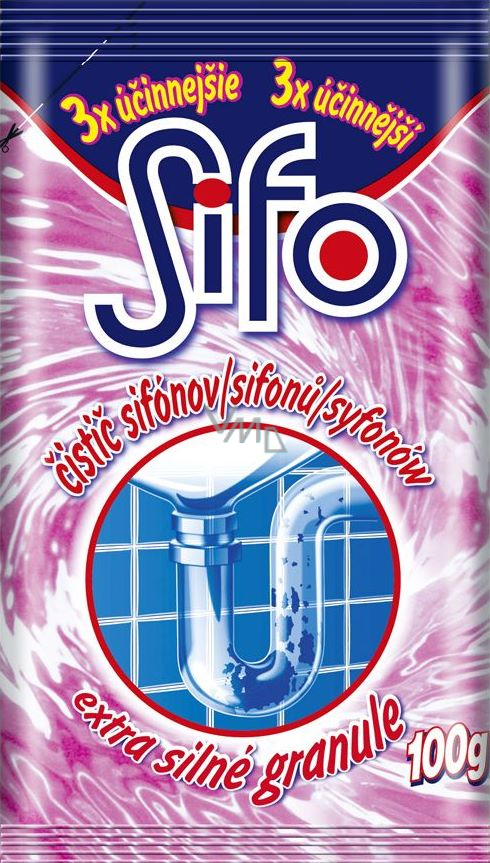 Sifo środek czyszczący syfony jest przeznaczony do czyszczenia syfonów, umywalek, odpływów, wanien WC i kuchennych zlewów. Rozpuszcza odpady kuchenne, tłuste osady, włosy.