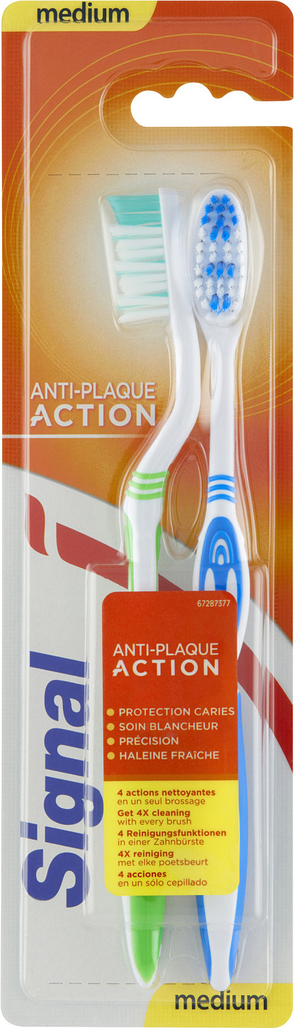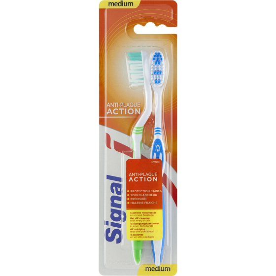 W tej wersji szczoteczki Signal znajdziesz korzystne opakowanie 1+1! Dentyści i higieniści stomatologiczni zalecają wymianę szczoteczki do zębów co 3 miesiące. Szczoteczkę do zębów należy używać 2 razy dziennie razem z pastą do zębów.