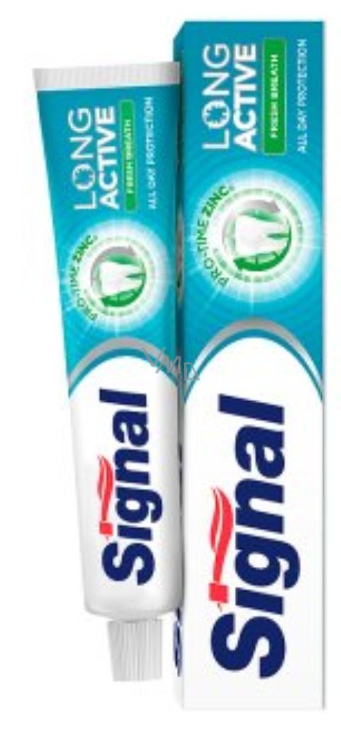 Zubní pasta Signal Long Active White Fresh chrání zuby před kazem, účinně odstraňuje plak a perfektně zuby bělí. Eliminuje riziko negativního účinku kyselin, které vznikají působením bakterií nacházejících se v plaku. Pasta rychle a šetrně odstraňuje zbytky jídel a chrání zuby i mezi jednotlivým čištěním. Signal Long Active Fresh Breath obsahuje fluorid, bylinné výtažky a zinek, který zajišťuje bakteriální rovnováhu v ústech. Používejte pravidelně kvalitní pastu, aby vaše zuby byly zdravé, silné a krásné!