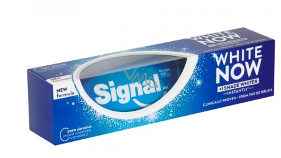 Unikátní zubní pasta s unikátním bělícím účinkem Signal White Now vám okamžitě zajistí viditelně bělejší zuby – a to již po prvním vyčištění! Modrá pěna pasty zanechá po vyčištění na zubech jemný modrý film, který ve spojení s přirozeným nažloutlým odstínem zubů vytvoří optický efekt bílého úsměvu. Aktivní složky mají zároveň postupný bělící účinek, a navíc, díky obsahu fluoru, pomáhá pasta také chránit zuby. Zbavte se nechtěného zažloutlého odstínu vašich zubů s excelentní bělicí pastou Signal White Now!