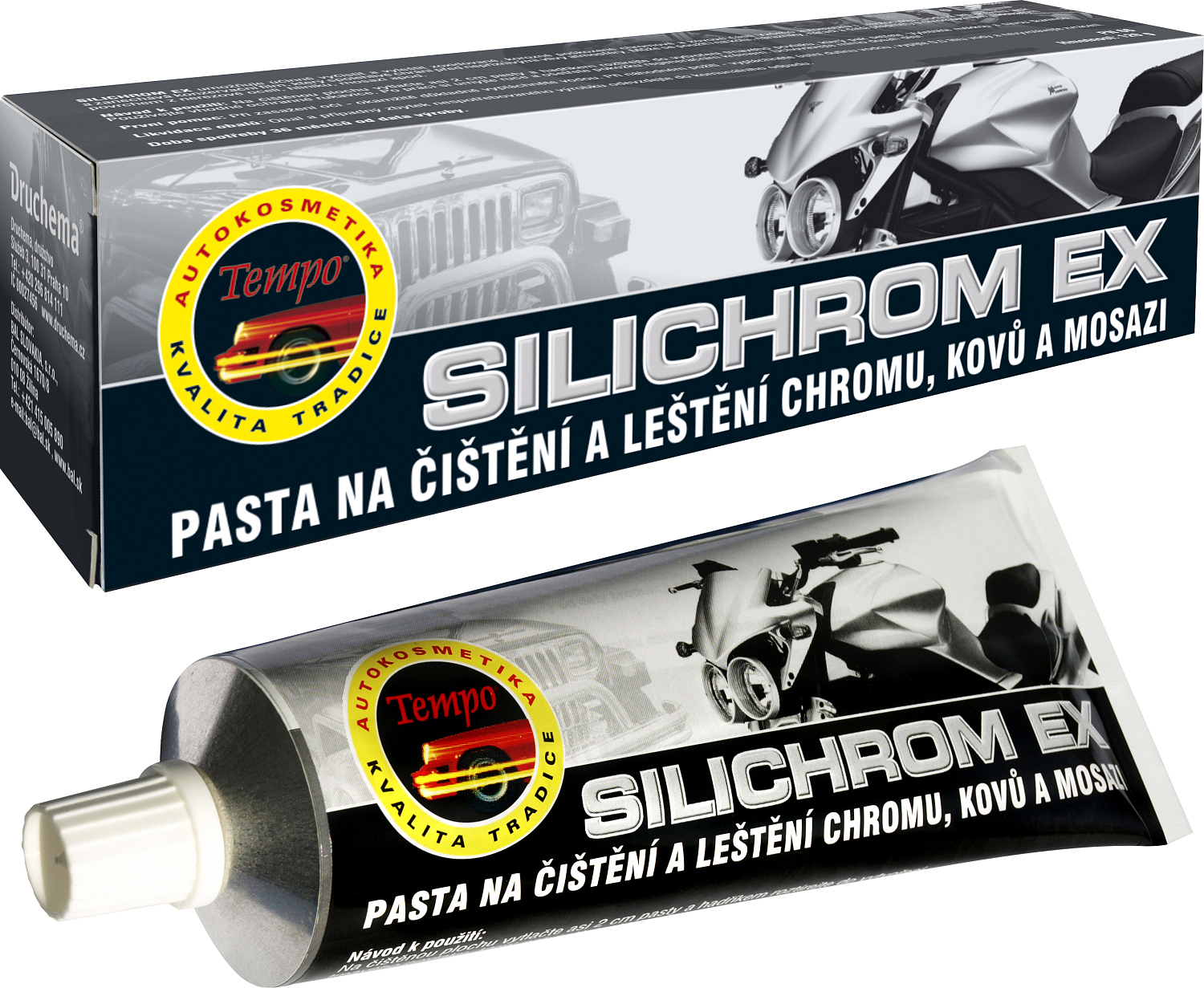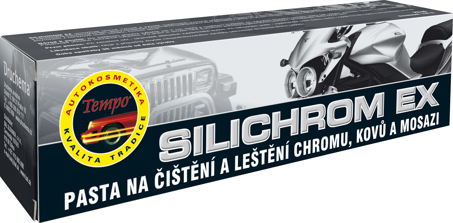 Druchema Silichrom Ex umożliwia skuteczne wyczyszczenie i wypolerowanie utlenionych, uszkodzonych korozją chromowych i metalowych części samochodów i motocykli. Nadaje im błyskotliwy połysk i pozostawia film konserwujący, który niezawodnie chroni przed niekorzystnymi wpływami atmosferycznymi. Może być używany także na koła, zderzaki, narzędzia i inne przedmioty z chromowanej, niklowanej powierzchni ze stali nierdzewnej, aluminium, mosiądzu itp. Jest nieodpowiedni do pokrytych tworzyw sztucznych.