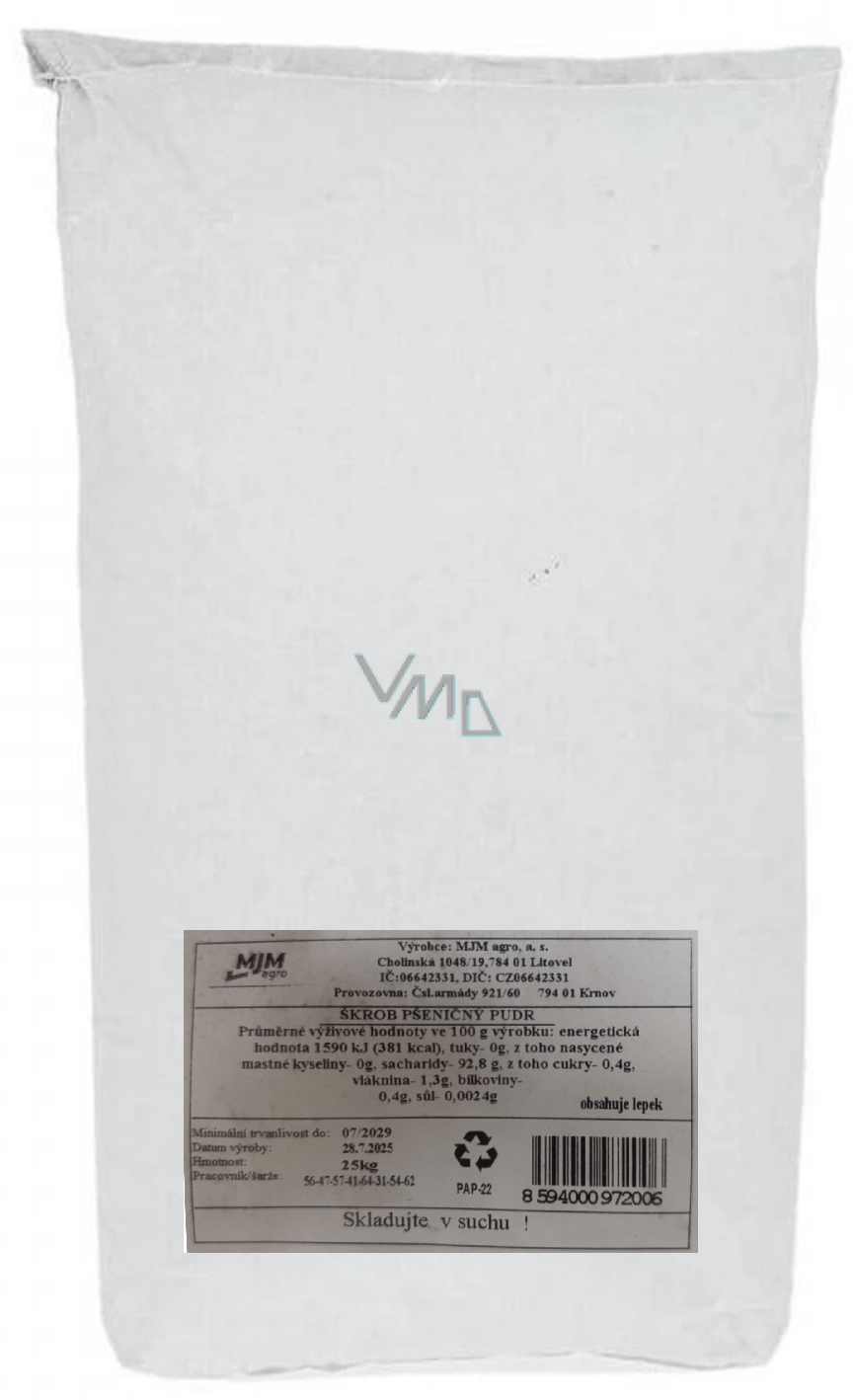 - Velmi pečlivě čištěný pšeničný jemný škrob.