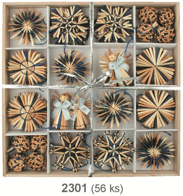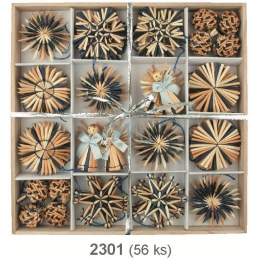 Slaměné dekorace v dřevěné krabičce s modrým dekorem 56 ks