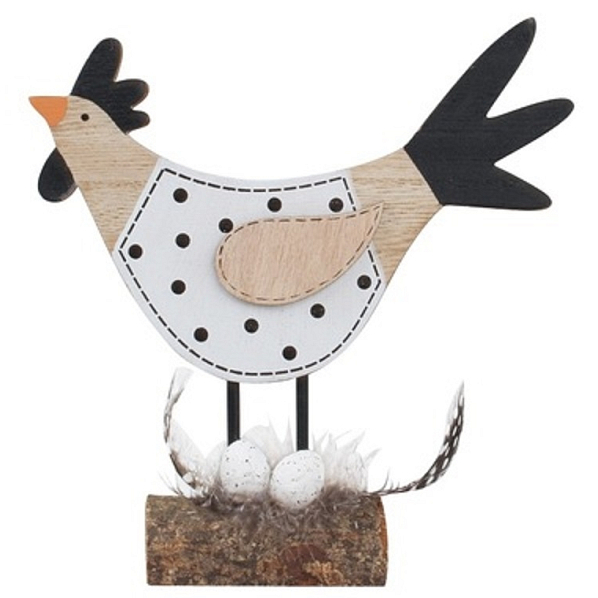 Czarno-biały kurczak z małymi styropianowymi jajkami i piórami na drewnianej podstawie będzie pasował wszędzie. Stwórz w domu z jego pomocą odpowiednią atmosferę wielkanocną. Jest to bardzo nowoczesna dekoracja designerska.