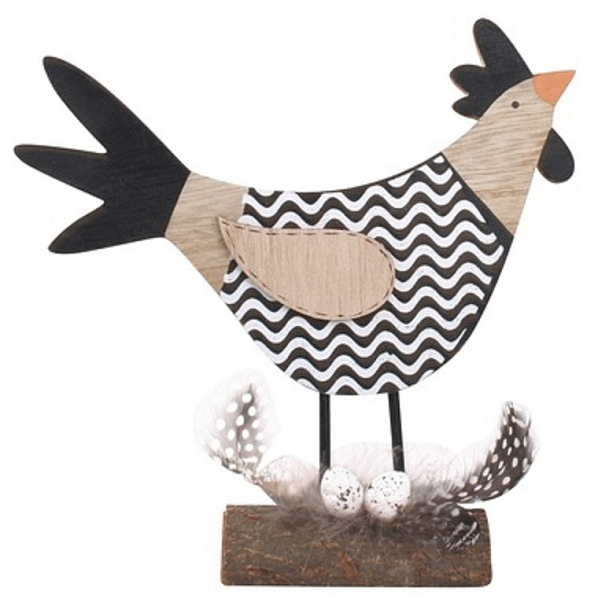 Czarno-biała kurczak z małymi styropianowymi jajkami i piórami na drewnianej podstawie będzie pasować wszędzie. Stwórz w domu z jej pomocą odpowiednią wielkanocną atmosferę. Jest to bardzo nowoczesna dekoracja w stylu design.