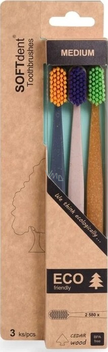 Softdent Eco Friendly je řada zubních kartáčků vyrobena z přírodně odbouratelných materiálů. Neobsahují žádné chemikálie a přídavné látky jako běžné plasty z ropy. Snižují produkci skleníkových plynů jako je CO2. Splňují veškeré evropské a světové normy a nařízení pro zdravotní nezávadnost. Materiál držadla je z cedrového dřeva.