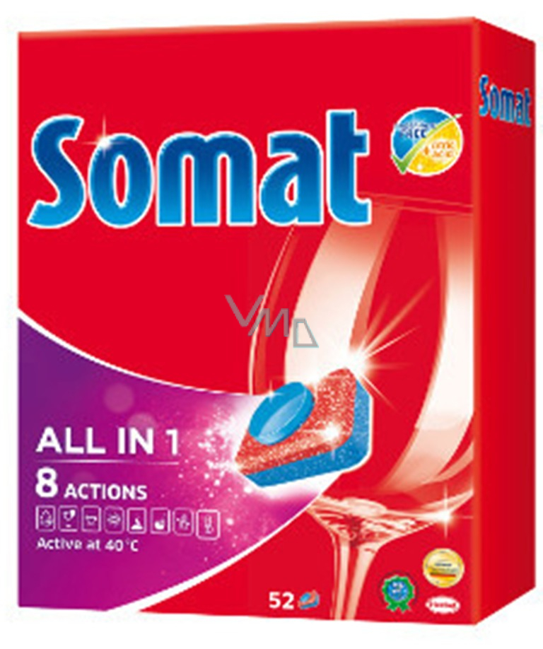 Tablety Somat jsou výborné jako mycí prostředek, který zaručí dokonalou čistotu. Tablety do myčky také ochrání sklo před jeho korozí. Výborně bojují se skvrnami do čaje a kávy a mají funkci oplachovače pro zářivý lesk. Funkce soli chrání vaše nádobí před usazeninami vodního kamene. Tablety Somat All in si skvěle poradí se zápachem, působí již při teplotě 40 °C a jsou rychle rozpustné.