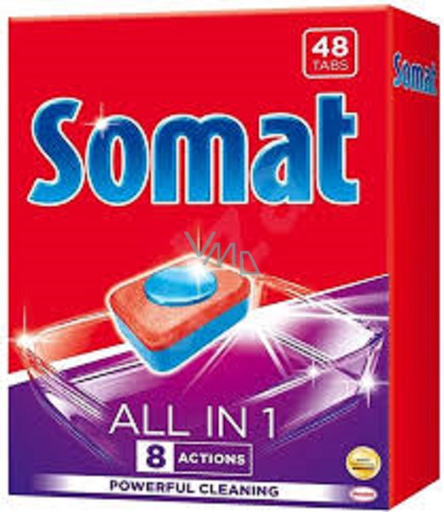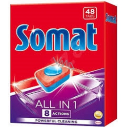 Tabletki Somat są doskonałe jako środek myjący, który zapewnia doskonałą czystość. Tabletki do zmywarki również chronią szkło przed jego korozją. Doskonale walczą z plamami po kawie i herbacie i mają funkcję nabłyszczacza dla lśniącego połysku. Funkcja soli chroni naczynia przed osadami kamienia wodnego. Tabletki Somat All in doskonale radzą sobie z zapachami, działają już przy temperaturze 40 °C i są szybko rozpuszczalne.