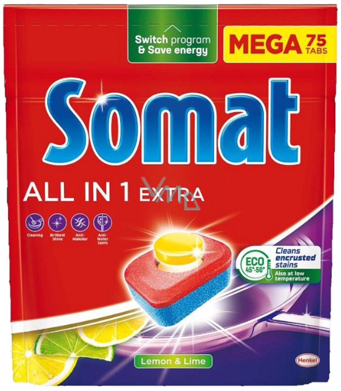 S Somat All-in-1 Extra Lemon & Lime tablety do myčky dosáhnete perfektní čistoty a dlouhotrvající svěžesti při každém mycím cyklu, a to s ohledem na úsporu energie a ochranu životního prostředí. Užijte si zářivě čisté nádobí a ekologicky šetrné mytí s Somat!