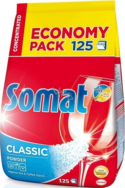 - Díky výkonným čisticím složkám prášku Somat Classic Powder jsou spolehlivě odstraněny i ty nejodolnější skvrny, jakými jsou zbytky připečených těstovin či brambor.