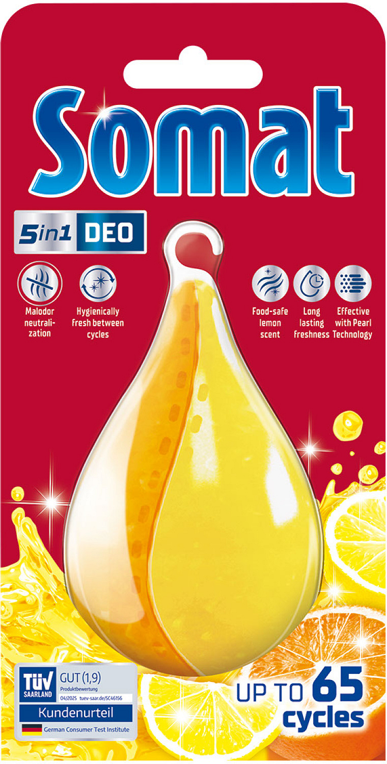 W zmywarce czasami może pojawić się nieprzyjemny zapach, szczególnie gdy zmywarka nie jest używana codziennie. Pomocą może być środek Somat Deo Duo-Pearls Cytryna & Pomarańcza, który zapewnia długotrwałą cytrynową świeżość i neutralizuje zapachy w Twojej zmywarce. Somat Deo Duo-Perls trwa około 60 cykli mycia.