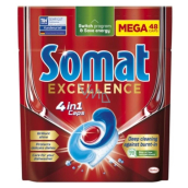 Somat Excellence tabletki do zmywarki na mycie naczyń zawierają premiowy środek wielofunkcyjny do mycia naczyń wyprodukowany z proszku w połączeniu z 3 unikalnymi stałymi żelowymi komorami w biodegradowalnej folii rozpuszczalnej w wodzie. Dzięki silnemu składnikowi, który działa przeciwko opornym zabrudzeniom i jednocześnie nie pozostawia żadnych resztek ani zaschniętych plam od wody, twoje naczynia będą idealnie czyste. Somat Excellence tabletki do zmywarki mają biodegradowalną folię 100% rozpuszczalną w wodzie.