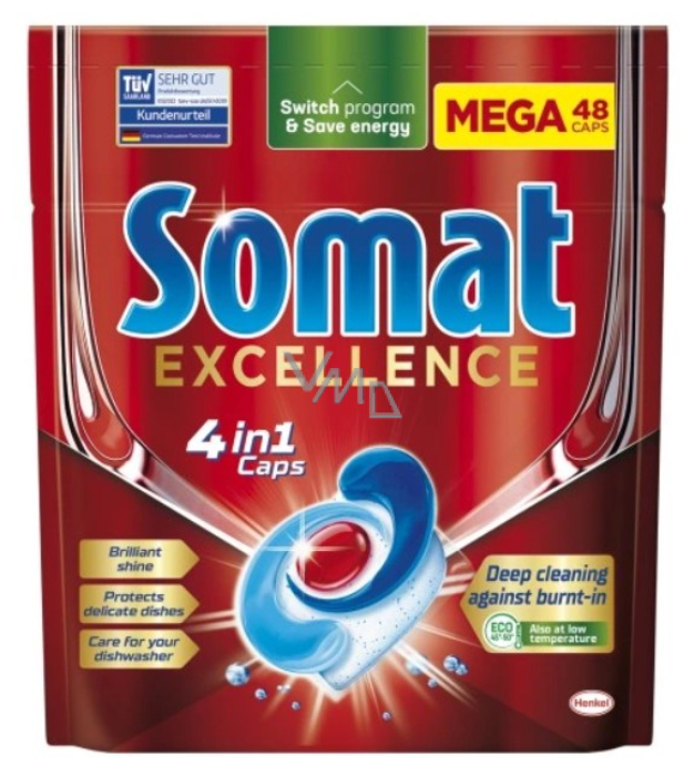 Somat Excellence tabletki do zmywarki na mycie naczyń zawierają premiowy środek wielofunkcyjny do mycia naczyń wyprodukowany z proszku w połączeniu z 3 unikalnymi stałymi żelowymi komorami w biodegradowalnej folii rozpuszczalnej w wodzie. Dzięki silnemu składnikowi, który działa przeciwko opornym zabrudzeniom i jednocześnie nie pozostawia żadnych resztek ani zaschniętych plam od wody, twoje naczynia będą idealnie czyste. Somat Excellence tabletki do zmywarki mają biodegradowalną folię 100% rozpuszczalną w wodzie.