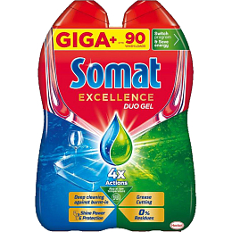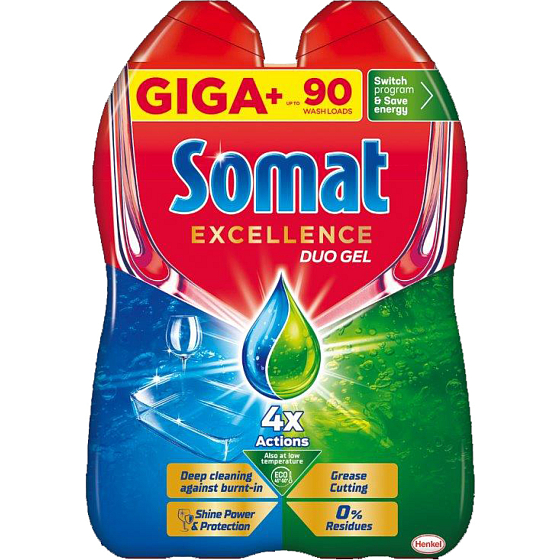 Ochrona przed plamami z kamienia wapiennego. Somat Excellence Duo Żel - nasze najlepsze składniki żelu Somat zapewniają skuteczne czyszczenie i olśniewający blask nawet w niskich temperaturach w programach eco i krótkich. Unikalna kombinacja dwóch uzupełniających się receptur zapewnia głębokie czyszczenie przypaleń oraz silne działanie odtłuszczające. Dla natychmiastowego efektu i ekstra blasku naczyń. Nawet w niskich temperaturach w programach eco i krótkich pozostawia olśniewająco czyste naczynia bez osadów.
