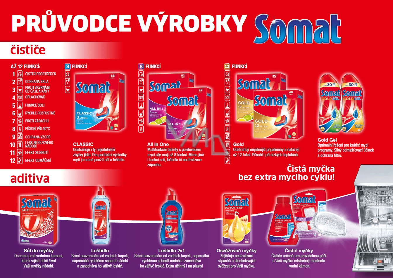 Zlatý standard v čistení! Díky jeho dvoj-komorové láhvi, jedině Somat umožňuje kombinaci dvou různých kapalných formulí.