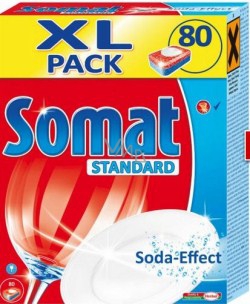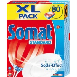 Tablety Somat Standard účinně odstraňují zaschlé skvrny a zbytky jídla. Pro dokonalý výsledek používejte společně s tabletami také Somat sůl a Somat oplachovač.