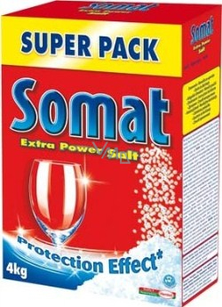 Kuchyňská sůl není vhodná - obsahuje složky, které se při mycím procesu nerozpustí a mohou poškodit mycí mechanismus myčky. Proto předcházejte problémům a používejte sůl Somat Extra Power.