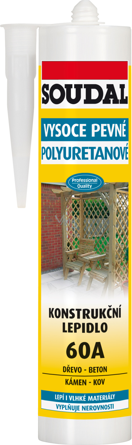 Soudal 60A konstrukční polyuretanové lepidlo na dřevo je konstrukční lepení dřevěných částí, dřevěných konstrukčních prvků a nábytku, lepení mnoha dalších druhů materiálů jako cihly, beton, kovy, Guma, polystyren, pěnové hmoty atd. Výroba okenních a dveřních rámů, výroba vrstvených panelů. Nestékavé konstrukční polyuretanové lepidlo na dřevo s velmi vysokou lepicí silou 100 kg/cm². Po vytvrzení je lepidlo na dřevo transparentní a trvale vodě odolné D4 (ČSN EN 204). Nezanechává skvrny a lze použít na mírně vlhké podklady. Lze použít na lepení ne zcela rovných podkladů, v průběhu vytvrzování mírně napěňuje. Rychleschnoucí, vyplňovací schopnosti díky schopnosti zpěnění, vysoká lepící síla, výtečná vodovzdornost.