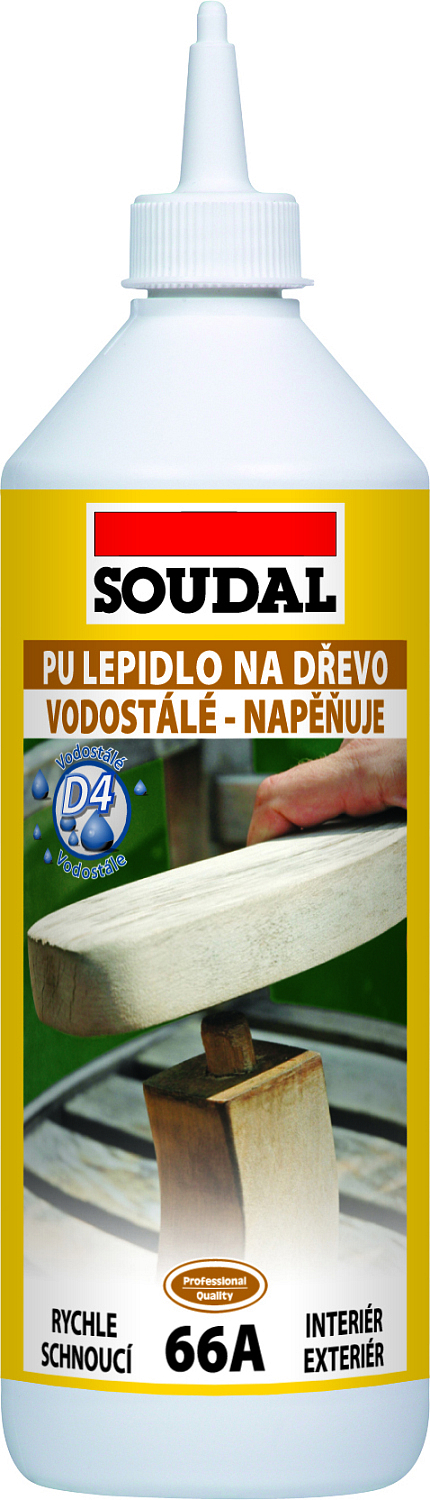 Soudal 66A poliuretanowe klej do drewna, który charakteryzuje się krótkim czasem schnięcia, bardzo wysoką siłą klejenia i najwyższą klasą odporności na wodę D4 (ČSN EN 204). Ma zdolności wypełniające - napowietrza się, charakteryzuje się wysoką siłą adhezyjną. Można stosować na wilgotne drewno. Obciążenie lub ściskanie w imadłach zwiększa ostateczną wytrzymałość połączenia.
