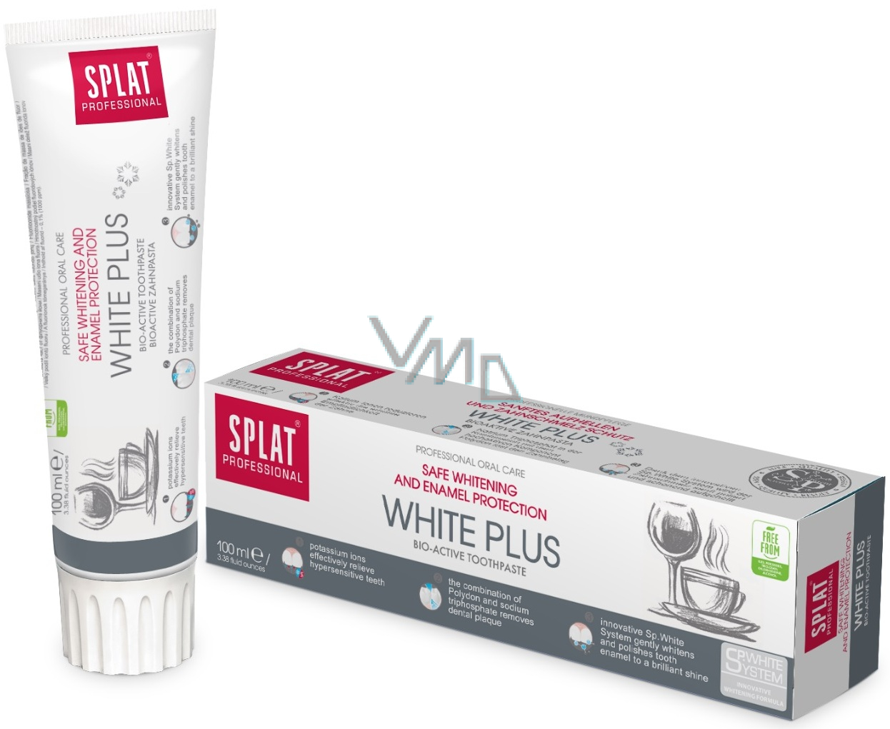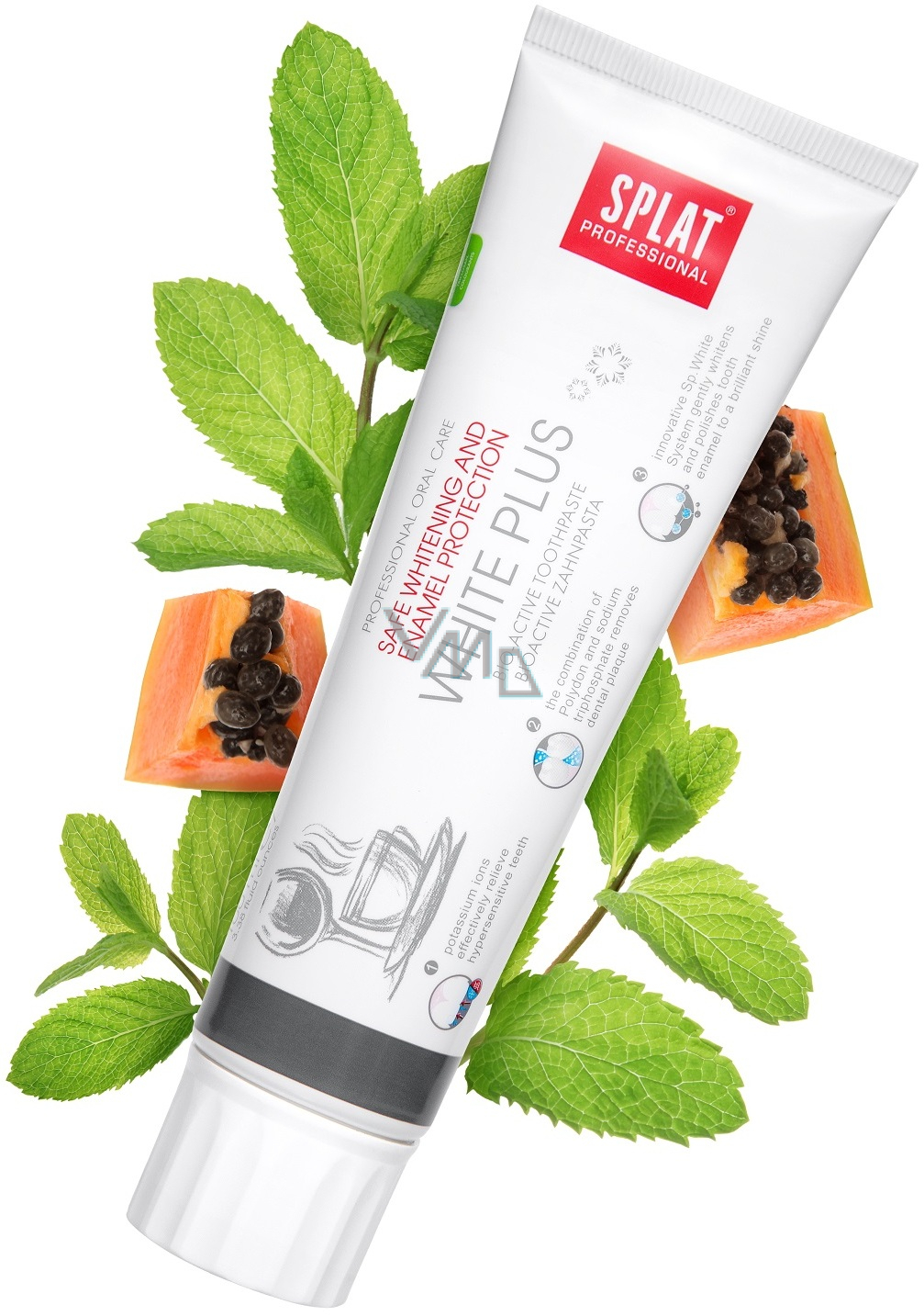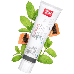 Splat Professional White Plus bioaktivní zubní pasta obsahuje inovativní systém Sp.White systém, který bezpečně bělí a leští zuby do vysokého lesku a pomáhá zachovat bělost zubů po dlouhou dobu. Kulaté leštící částice v kombinaci s bělicí složkou Polydon a přírodními enzymy z papáji vám zajistí bělost zubů i v těžko dostupných místech dutiny ústní a zároveň dokonale vyčistí povrch vašich zubů do hladka. Zubní pasta White Plus je ideální pro milovníky kávy, čaje a kuřáky. Bez fluoridu.