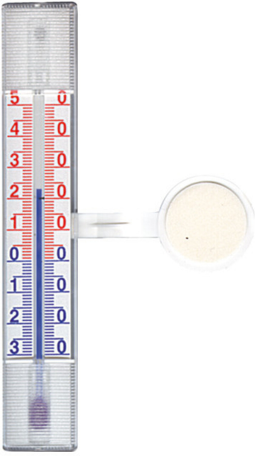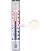 Płaski okienny termometr, samoprzylepny, wymiary 140 × 25 mm, plastikowy.