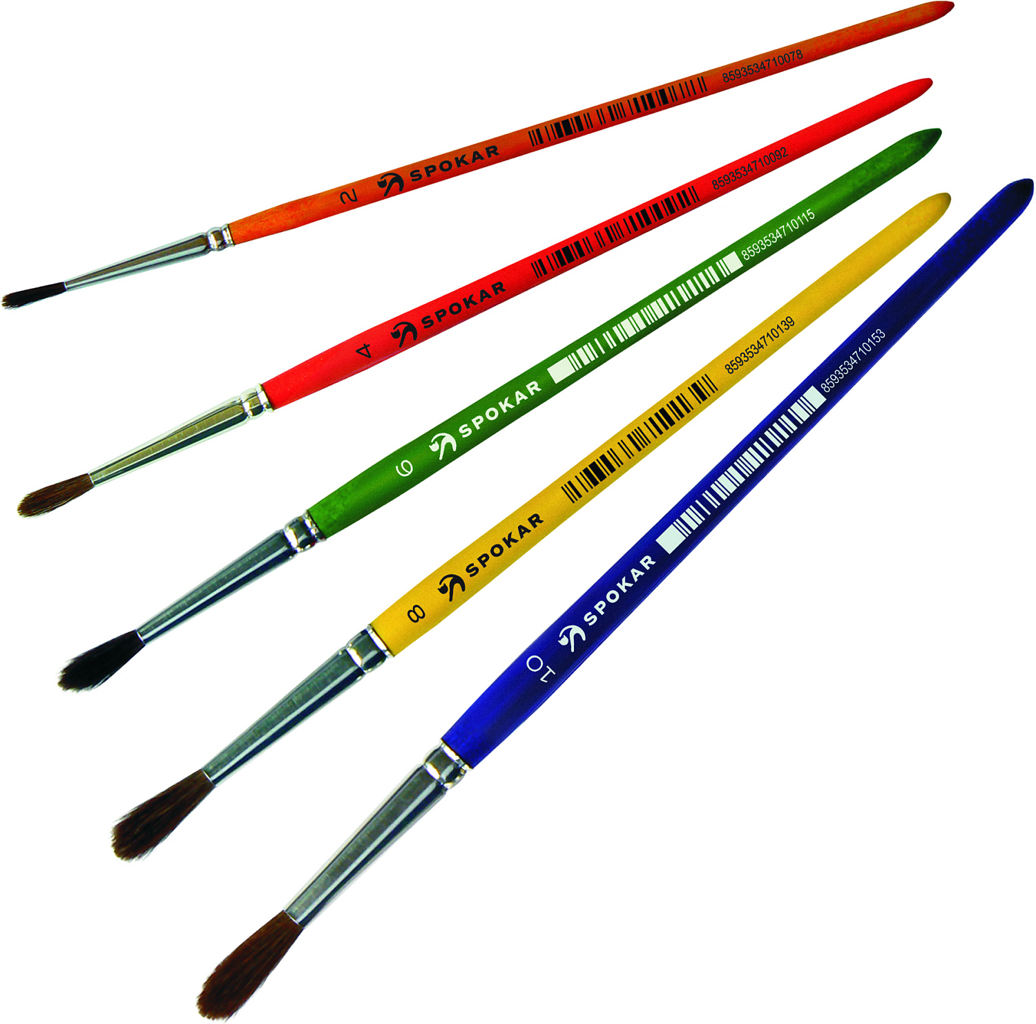 Wysokiej jakości pędzel szkolny SPOKAR, okrągły, ma drewniany lakierowany uchwyt, delikatne włókna zwierzęce, widoczna długość włókien od 11 do 20 mm, zestaw zawiera rozmiary nr 2, 4, 6, 8, 10.