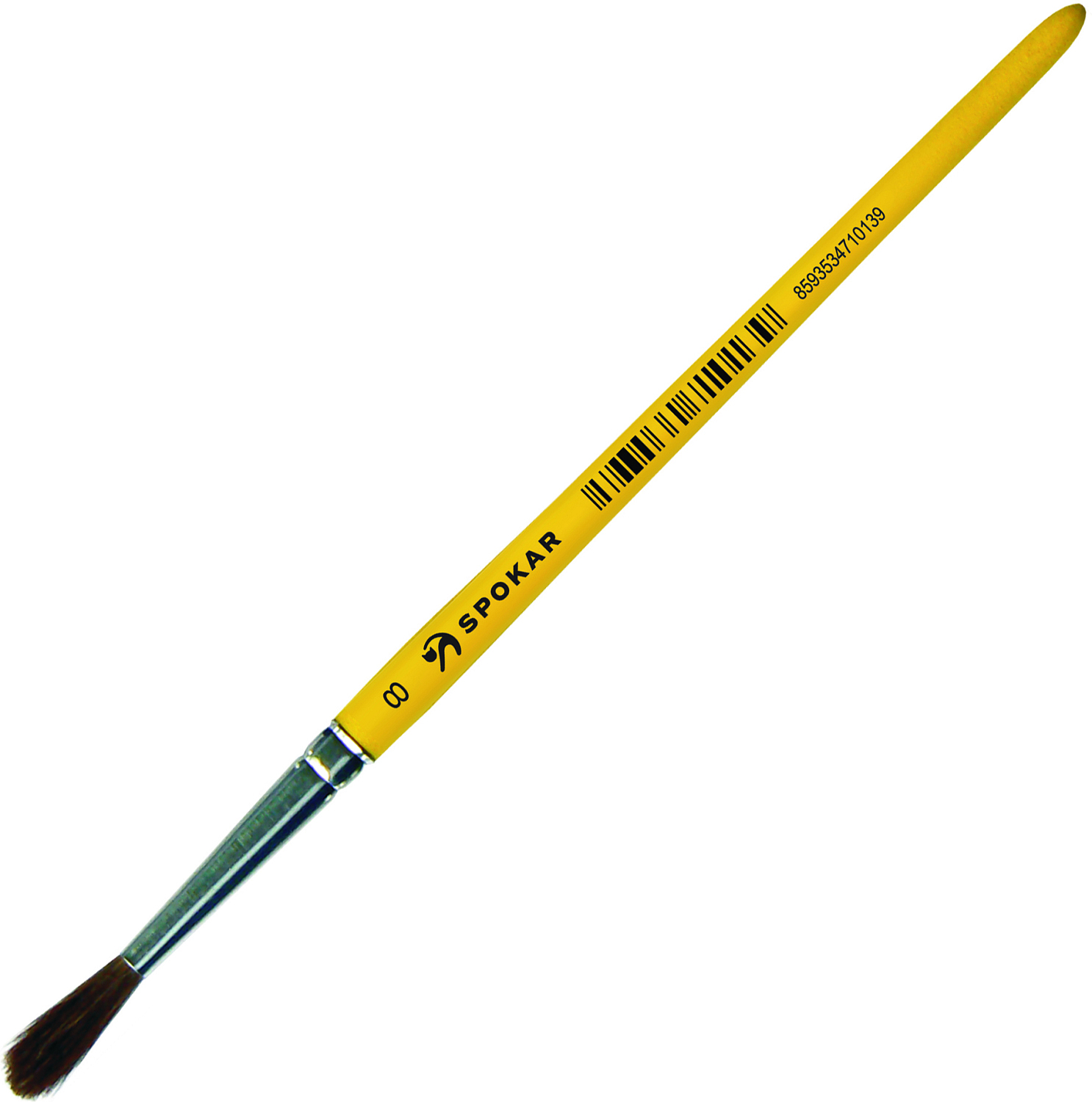Wysokiej jakości pędzel szkolny SPOKAR, okrągły, ma drewniany lakierowany uchwyt, delikatne włókna zwierzęce, widoczna długość włókien 18 mm, rozmiar numer 8.