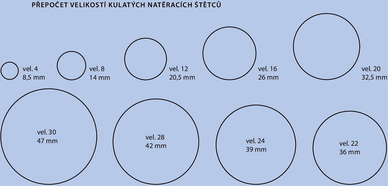 Podczas gdy w przypadku pędzli płaskich wymiar określa szerokość pędzla, tzn. jego osadzenie w calach, w przypadku pędzli okrągłych rozmiary tradycyjnie oznaczone są numerem, który nie ma bezpośredniego związku z średnicą pędzla (patrz. rysunek).