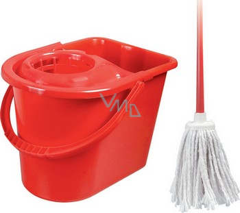 Zestaw do sprzątania SPOKAR zawiera okrągłe wiadro o pojemności 10 litrów, wyciskacz, metalowy trzonek, mop bawełniany 160 g. Zestaw ma kolor czerwony.