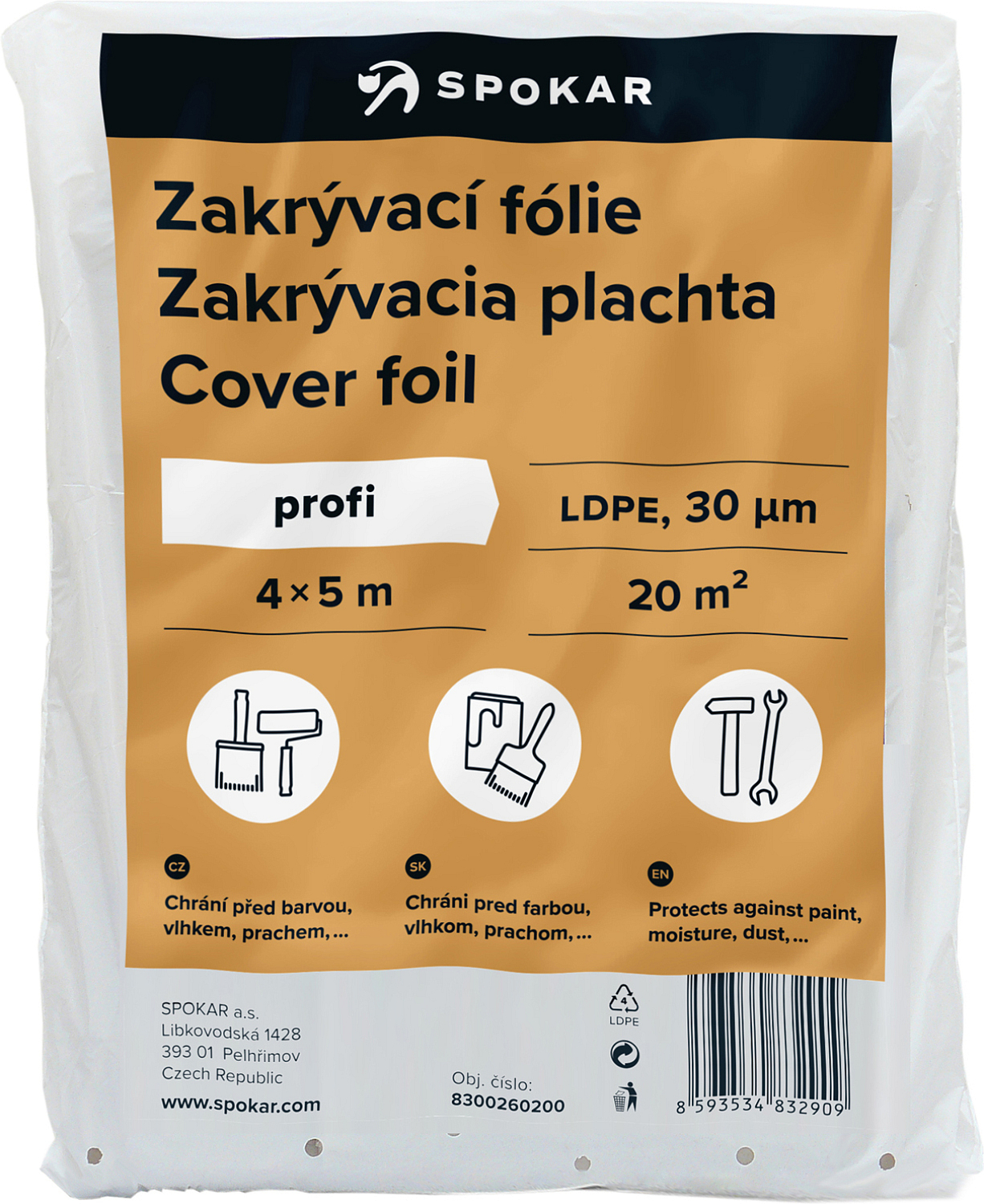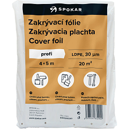 Spokar folia ochronna o rozmiarze 4 × 5 m o grubości 30 µm (mikronów) LDPE. Folie ochronne stosuje się do zakrywania podłóg, mebli. Chroni przed farbą podczas malowania, wilgocią, kurzem.