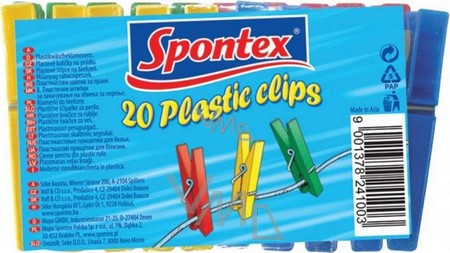 Hledáte-li spolehlivé kolíčky na prádlo, pak zvolte prověřenou značku Spontex. V praktickém balení vám nabízí 20 kolíčků na věšení prádla. Jedná se o vícebarevnou sadu klasických kolíčků vyrobených z odolného plastového materiálu a vybavených solidní ocelovou pružinou. Kolíčky na prádlo se nelámou ani nerezavějí, takže je můžete bez obav použít k přichycení vašeho vypraného prádla i na venkovní prádelní šňůru. Díky plastovému provedení je můžete v případě potřeby i snadno umýt.