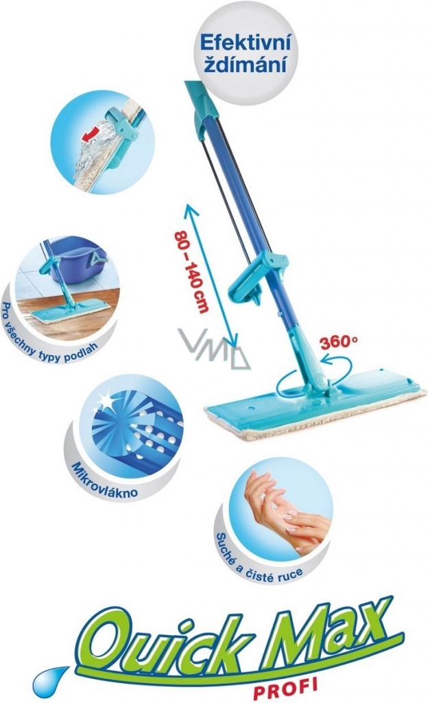 QuickMax Profi mop Vám umožní dokonalý a rychlý úklid podlahy bez nutnosti namáčení rukou a ohýbání zad. Zatáhnutím rukojeti vám efektivní samoždímací systém mop dokonale vyždímá. Je vhodný na všechny druhy podlah – na suché i mokré vytírání. Náhrada z mikrovlákna absorbuje prach a nečistoty do svojí struktury, úklid je účinný i bez použití čisticích prostředků.