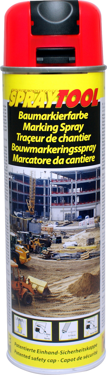 Znacznikowy spray Spraytool od Motip do profesjonalnego oznaczania budowlanego dla budynków i budowli inżynieryjnych, placów budowy i budownictwa drogowego. Znacznikowy spray może być również używany przy budowie tuneli i wydobyciu.