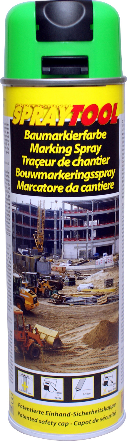 Znacznikowy spray Spraytool od Motip do profesjonalnego oznaczania budowlanego dla budynków i inżynieryjnych, placów budowy i budownictwa drogowego. Znacznikowy spray może być również używany podczas budowy tuneli i wydobycia.