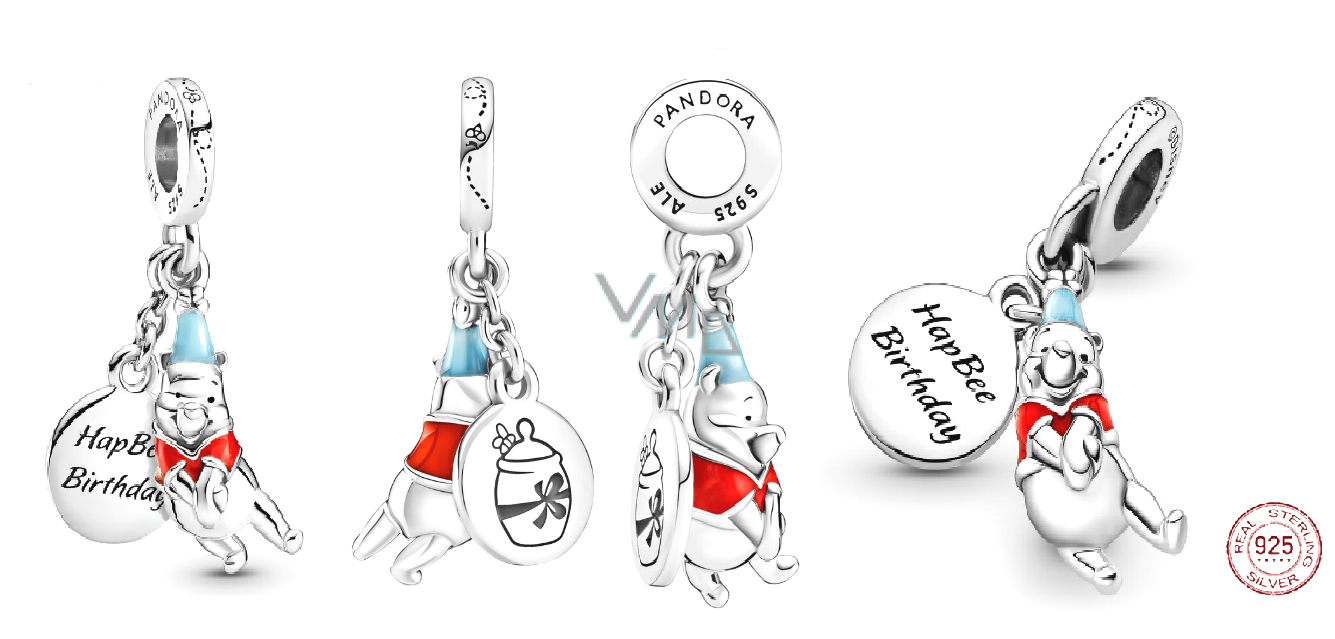 Zawieszka wykonana ze srebra i składająca się z dwóch części, ozdobiona Kubusiem Puchatkiem w czerwonej koszulce oraz medalionem z miodem i napisem "Happy Birthday" (Wszystkiego najlepszego). Urocza zawieszka rozświetli twoją bransoletkę. Niezależnie od tego, czy chcesz przypomnieć sobie wyjątkowy moment, czy po prostu dodać swojej bransoletce blasku, ten urok ze srebra sterlingowego z pewnością zrobi wrażenie. Dodaj go do swojej kolekcji już dziś i ciesz się jego ponadczasowym pięknem w nadchodzących latach!
