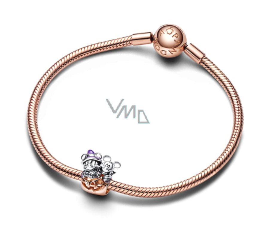 Świeci w ciemności. Ciesz się magicznym Halloween z Halloweenową koralką Disney Mickey Mouse & Minnie Mouse. Projekt koralika jest delikatnie pozłacany 14-karatowym różowym złotem i charakteryzuje się wyrzeźbionymi i wygrawerowanymi detalami, które tworzą realistyczny wymiar. Z koralika wyskakują srebrne Mickey i Minnie Mouse. Mickey ma na sobie kostium Halloweenowy z przejrzystą emalią, podczas gdy Minnie nosi kostium z detalami świecącymi w ciemności. Ten zabawny element, który jest uroczym dodatkiem do kolekcji wszystkich miłośników Disneya lub Halloween, doda Twojemu stylowi przerażającej zabawy.