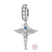 Wisiorek z kaduceuszem, symbolem medycyny, składający się z dwóch splecionych węży na trzonie z anielskimi skrzydłami, ozdobiony niebieskimi i białymi błyszczącymi kamieniami cyrkonowymi.