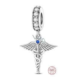 Wisiorek z kaduceuszem, symbolem medycyny, składający się z dwóch splecionych węży na trzonie z anielskimi skrzydłami, ozdobiony niebieskimi i białymi błyszczącymi kamieniami cyrkonowymi.