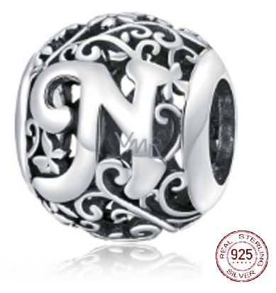 Charm Srebrna 925 Magiczna abeceda litera N z kwiatami, koralik na bransoletkę