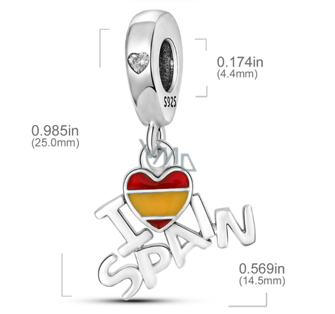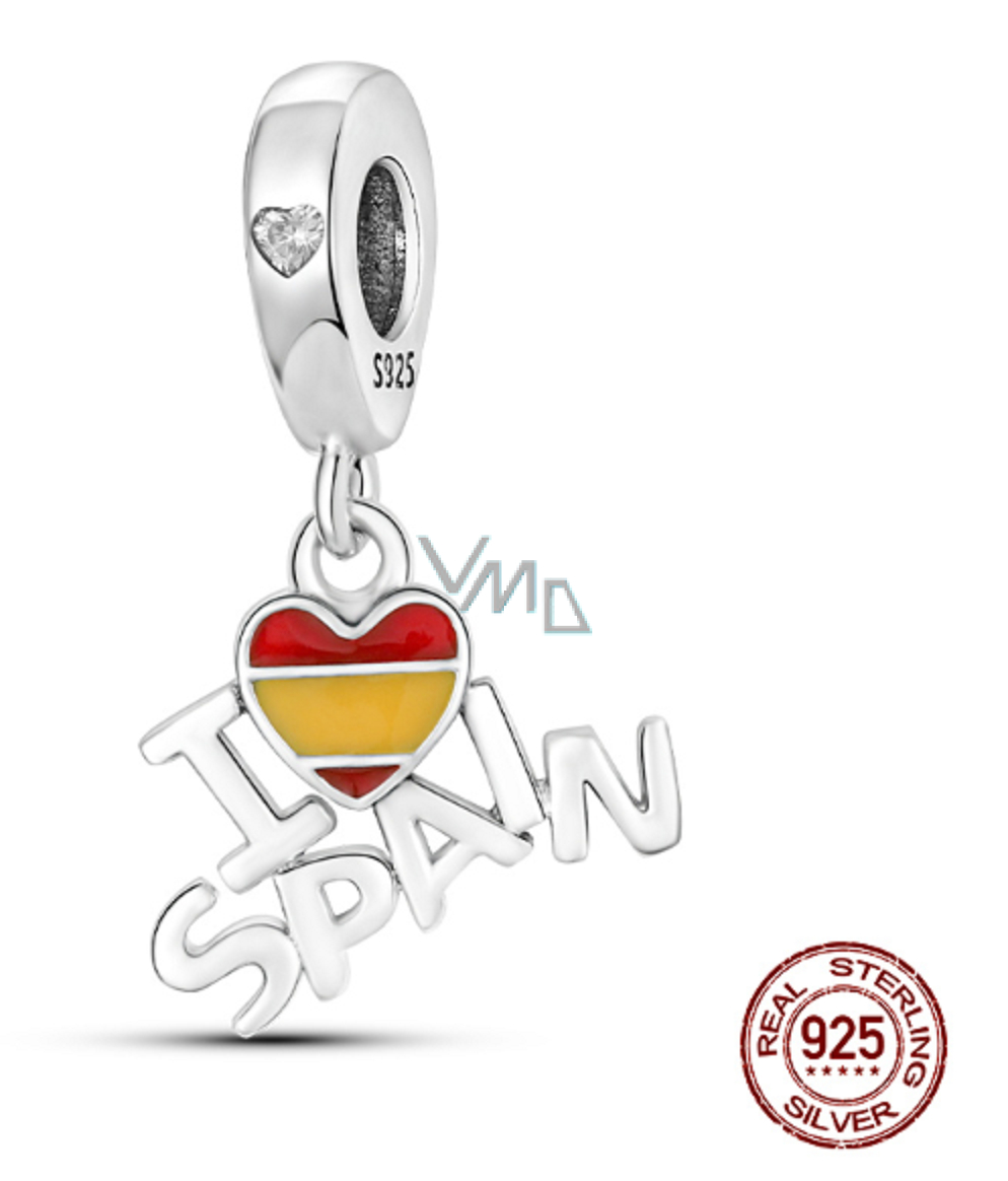 Charm Srebrna 925 z Hiszpanii flaga serce - Kocham Hiszpanię, 2w1 zawieszka na bransoletkę podróżniczą