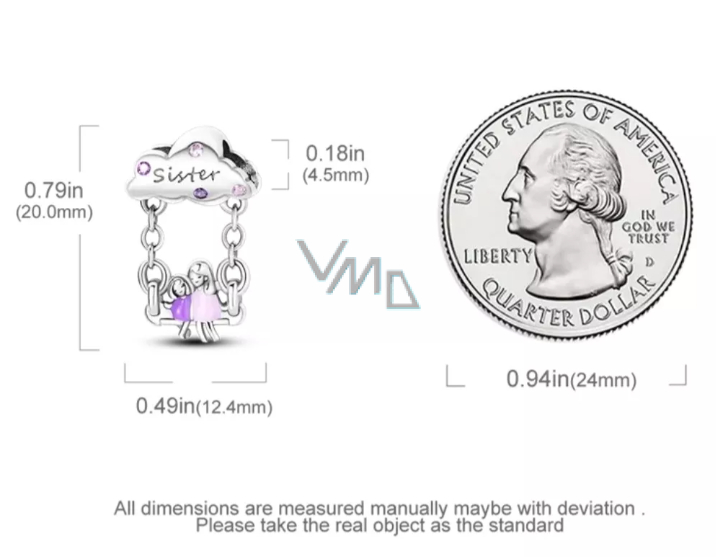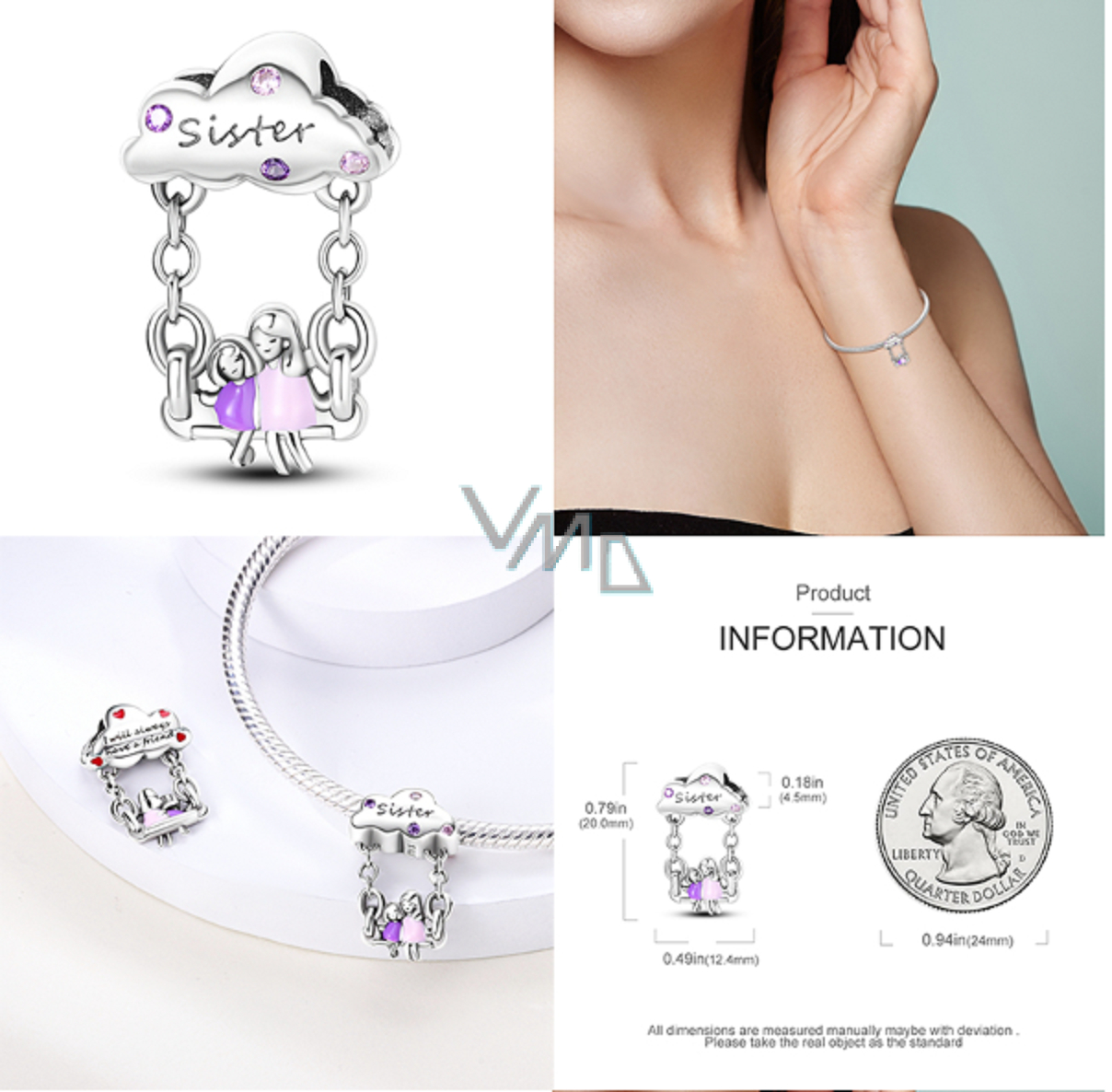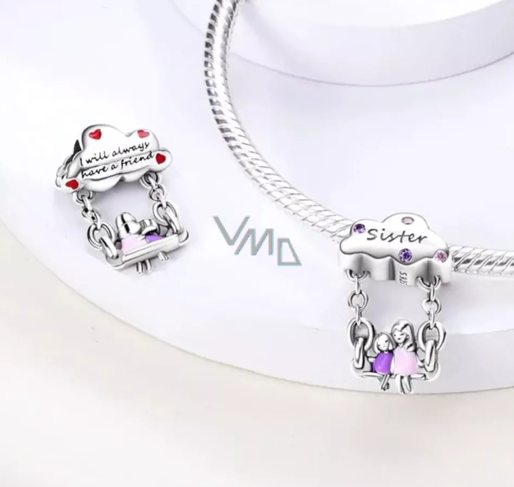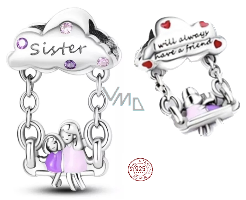 Wisząca zawieszka z dwoma kołyszącymi się dzwoneczkami z łuku z wygrawerowanym słowem „siostra“ po jednej stronie i "I will always have a friend" co oznacza "Zawsze będę twoim przyjacielem" po drugiej stronie. Zaprojektowana z gładkim różowym, fioletowym i czerwonym szkliwem oraz błyszczącymi różowymi i fioletowymi kamieniami cyrkonowymi. Ta srebrna zawieszka jest wymyślna z subtelnymi detalami.