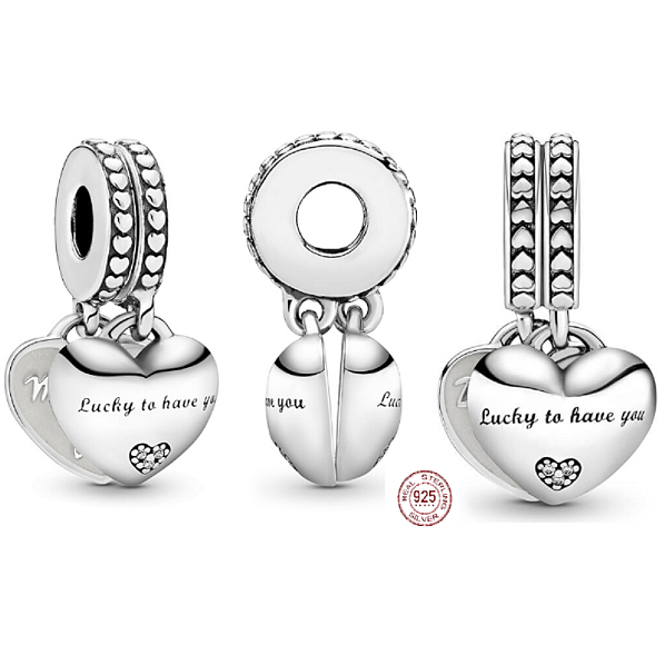 Stylowy naszyjnik wykonany ze srebra próby 925, wiszące naszyjniki w kształcie serca, na wewnętrznych stronach powierzchnia jest szkliwiona, z napisem "Daughter-in-law" Synowa i "Mother-in-law" Teściowa, zewnętrzną stronę zdobi napis "Lucky to have you" Szczęśliwa, że cię mam i małe serduszko zdobione kamieniami cyrkonii, koralik można rozdzielić na dwie części. Pasuje do bransoletek. Pokaż synowej lub swojej nowej teściowej, że o niej myślisz.