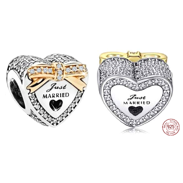 Uczcij swój wyjątkowy dzień tym pięknym charms'em ze srebra próby 925 i delikatnie pozłacanym złotem, który z dumą ogłasza Just Married - Nowożeńcy. Jego romantyczny kształt serca i delikatne zdobienia z něj wyrażają oszałamiającą deklarację miłości i doskonały prezent dla panny młodej w jej dzień ślubu.