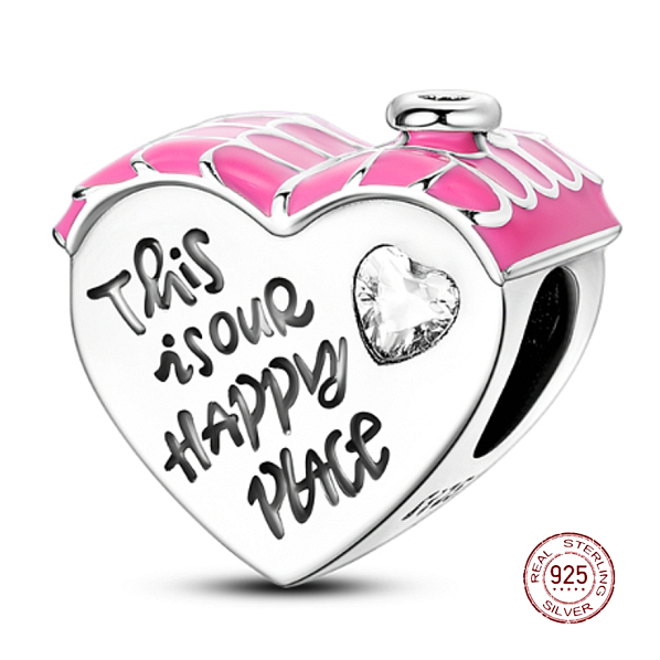 Zawieszka w kształcie serca z domkiem o czerwonym dachu, ozdobiona gładką emalią i napisem "This is our happy place" co oznacza „To jest nasze szczęśliwe miejsce” wygrawerowanym na odwrotnej stronie, z białym błyszczącym cyrkonią w kształcie serca, zawieszka, skomplikowanie wykonana z subtelnymi detalami.