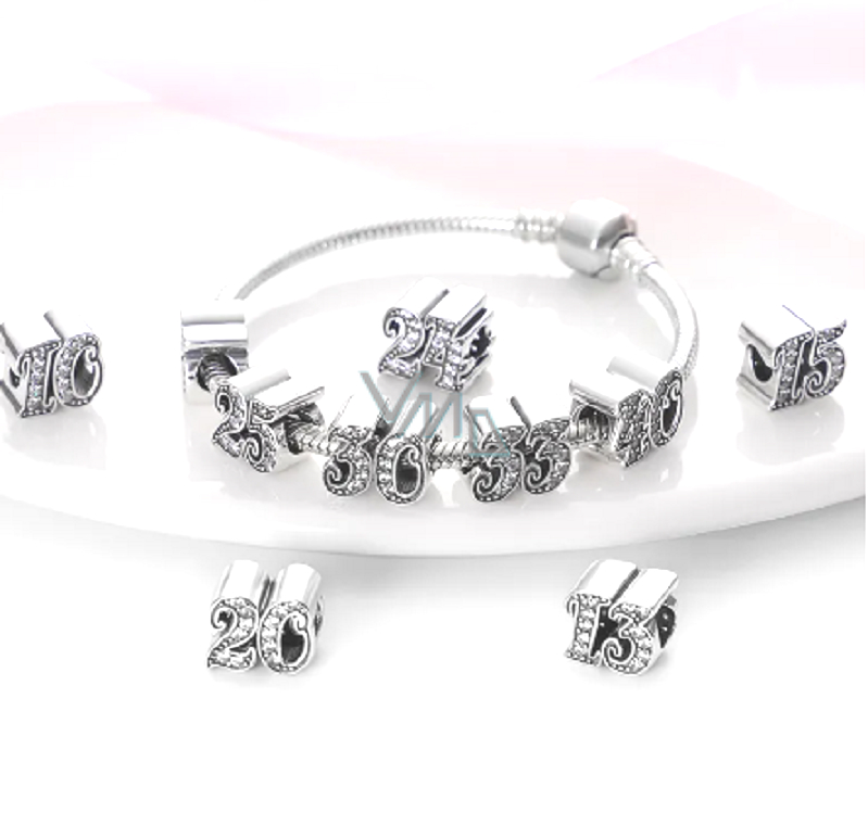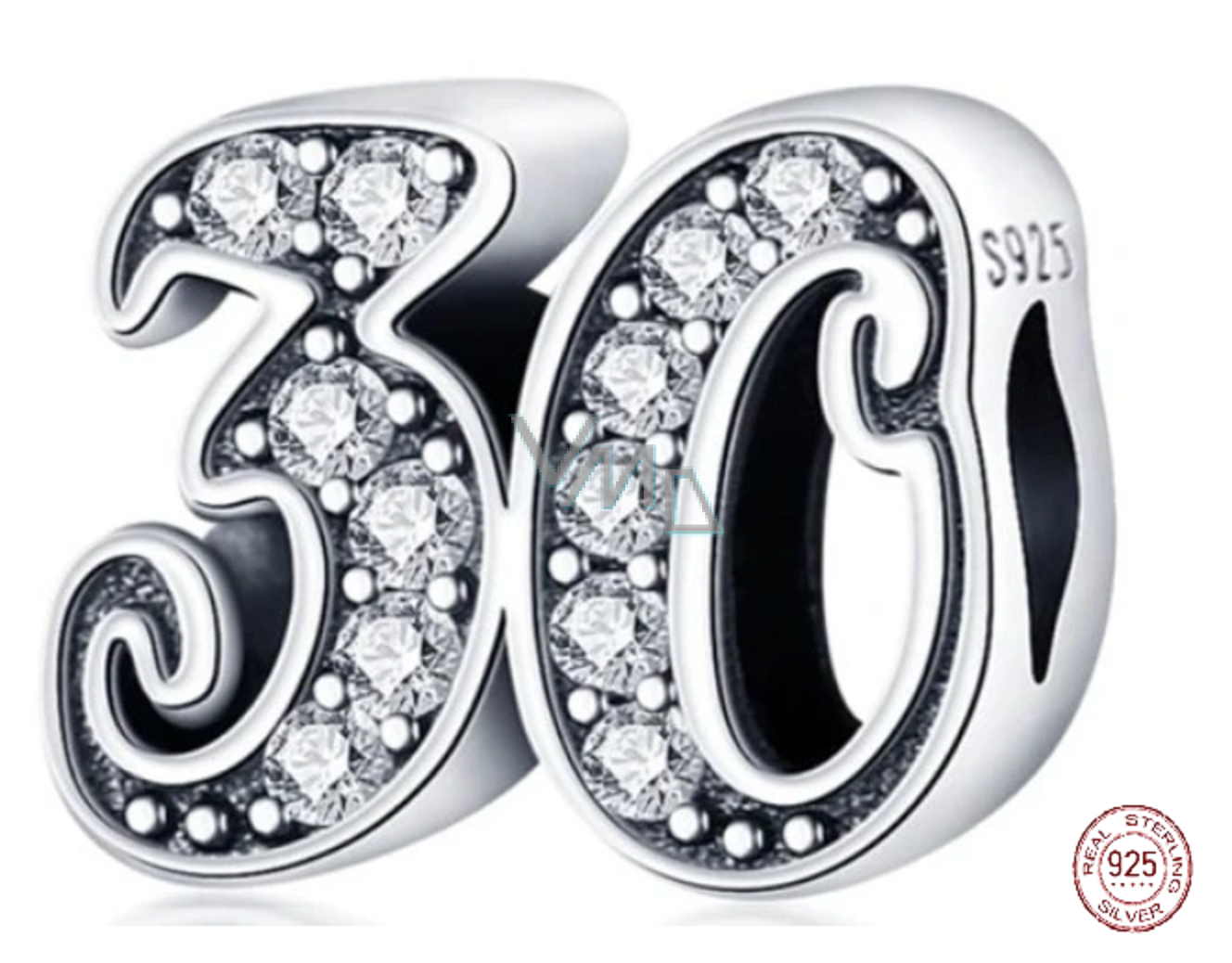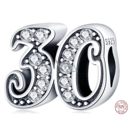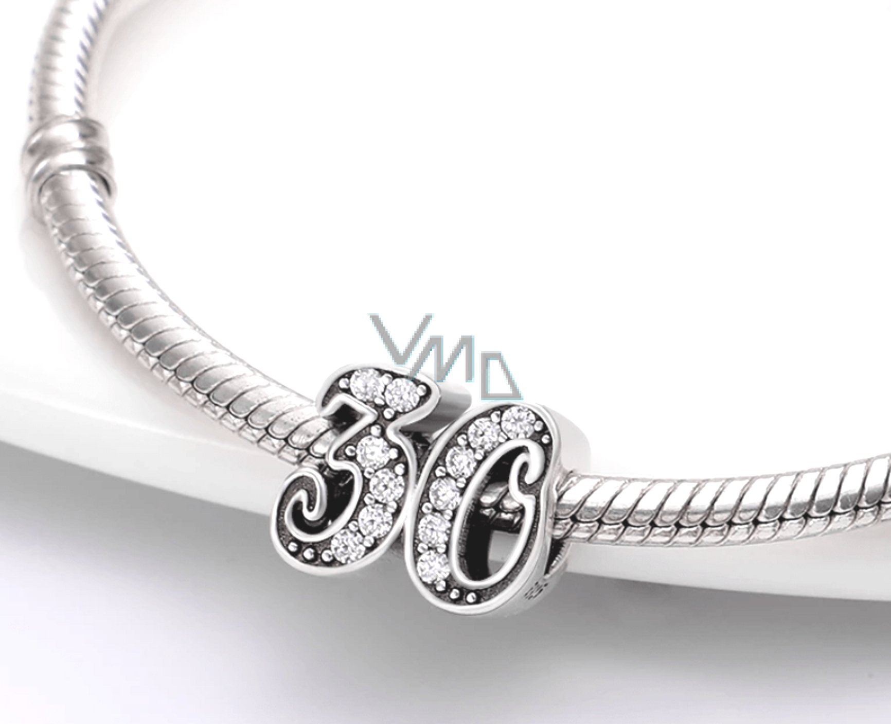 Ten srebrny wisiorek do bransoletek, wykonany na cześć 30. rocznicy lub szalonej 30. urodzin, wyróżnia się kubicznymi cyrkoniami i koralikowymi detalami.