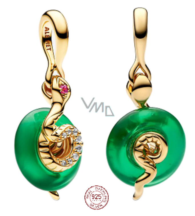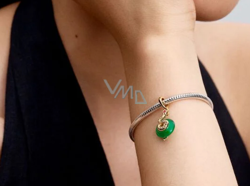 Charm Sterlingové stříbro 925 Had se zeleného skla Murano, přívěsek na náramek, rok Hada, zvíře