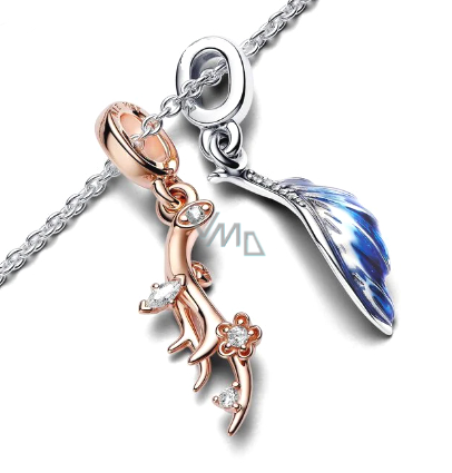 Przeplatana dwukolorowa zawieszka w kształcie poroża i zawieszki. Zakrzywione rogi ze stopu miedzi i srebra obejmują główne ciało oraz mniejszą gałąź z ostrymi krawędziami. Górna część głównego ciała poroża jest wyłożona okrągłym syntetycznym cyrkonią, ozdobiona ryflowanymi liśćmi i cyrkonią w kształcie markizy, z pięciolistną kwiatową kompozycją z koralikową cyrkonią, gdzie każdy okwiatowy listek jest otoczony trójwymiarowymi liniami.